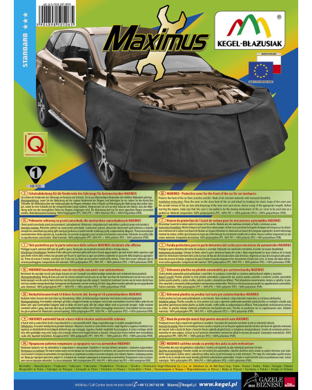 Pokrowiec został profesjonalnie wykonany i dobrze wykończony. Włóknina SPUNBOND, z której został uszyty pokrowiec odporna jest na różnego typu uszkodzenia. Od spodu tkanina jest miękka, a tym samym bezpieczna dla karoserii. Pokrowiec ochronny MAXIMUS wykonany jest w uniwersalnym, czarnym kolorze, dzięki czemu dobrze się prezentuje i jest niezwykle praktyczny w użyciu. Jest bardzo łatwy w czyszczeniu- wszelkie zabrudzenia można usunąć za pomocą wilgotnej ścierki z płynem. Pokrowiec jest łatwy i bezpieczny w montażu. Jak zostało już wcześniej wspomniane cała przednia część pokrowca podszyta jest materiałem antypoślizgowym. Boczne części mają natomiast specjalne „ języki” z materiału antypoślizgowego które można położyć na błotniki lub przełożyć je przez krawędź komory silnika. Dodatkowo dla pewniejszego trzymania pokrowiec ma gumki na końcach do zaczepienia o lusterka. Całość tworzy bardzo pewne mocowane, bez użycia jakichkolwiek metalowych elementów, przez co jest bardzo bezpieczny dla powłok lakierniczych. Pokrowiec praktycznie sam „przykleja się” do serwisowanego samochodu nie pozostawiając żadnych śladów po ścignięciu. Pokrowiec MAXIMUS to niezastąpiona pomoc w każdym zakładzie mechanicznym, w którym dba się o szybkość i schludność wykonywanej usługi.