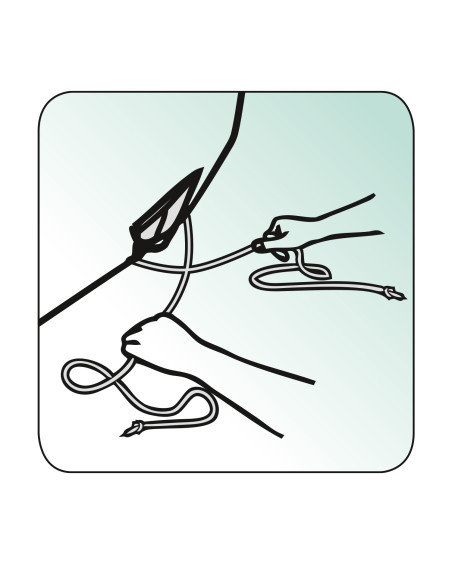 Pokrowiec stroną z popielatymi wykończeniami szwów na zewnątrz nasunąć od góry na stelaż i fotel, obracając tak pokrowiec aby kieszeń w dole pokrowca znajdowała się z przodu fotela. Przymocować pokrowiec do stelaża za pomocą taśm typu „rzep” wszytych w dolną, wewnętrzną stronę pokrowca. Skrzyżować linki ściągacza i mocno je zaciągnąć kierując siły równolegle do przodu fotela (patrz rysunek nr 1). Zawiązać linki ściągacza i sprawdzić czy węzeł się nie rozluźnia po pociągnięciu za ściągacz. Jeżeli węzeł się rozluźni, czynność powtórzyć zmieniając sposób wiązania. Węzeł wraz z linkami wsunąć do kieszeni pokrowca.