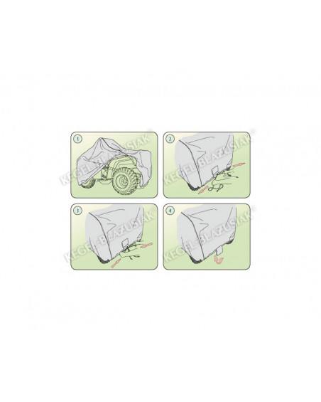 Wkładać na względnie czysty quad białą stroną pasa środkowego do wewnątrz a następnie maksymalnie mocno zaciągnąć linkę ściągacza pokrowca i prawidłowo ją zawiązać. Tylko właściwe sznurowanie zagwarantuje wytrzymałość wiązania. Zawiąż linkę zgodnie z instrukcją, a będziesz miał pewność, że pokrowiec przymocowany jest trwale i silnie a tym samym, że Twój pojazd jest w pełni bezpieczny. Zalecane wiązanie pozwoli na mocne scalenie dwóch końców linki, jednocześnie dając możliwość szybkiego jej rozwiązania.