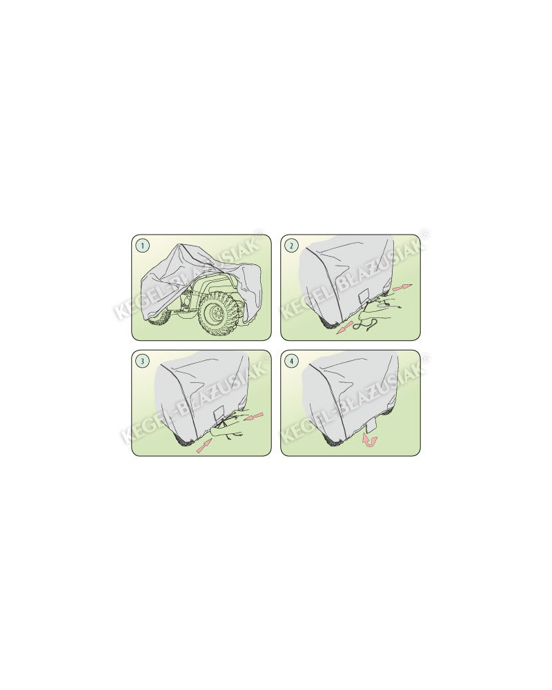 Park the quad in a place sheltered from wind in a way that prevents the quad from tipping over. Place the cover with the printed side outwards on a clean and dry quad, after the exhaust pipe and all engine components have cooled down (combustion quad) or the power has been switched off (electric quad). Cross the turnbuckle cords and pull them tightly directing the forces parallel to the rear of the quad (see figure 2). Tie the turnbuckle cords and check that the knot does not loosen when the turnbuckle is pulled. If the knot loosens, repeat the operation by changing the tying method. Then fasten the cover under the quad with Velcro-type straps sewn into the lower inner side of the cover. Ensure that both pairs of Velcro straps under the quad are securely fastened. Do not use the cover when charging the quad acumulator/battery or when transporting the quad on uncovered luggage racks and car transporters. Do not use the cover if damaged, dirty on the inside or leaking.