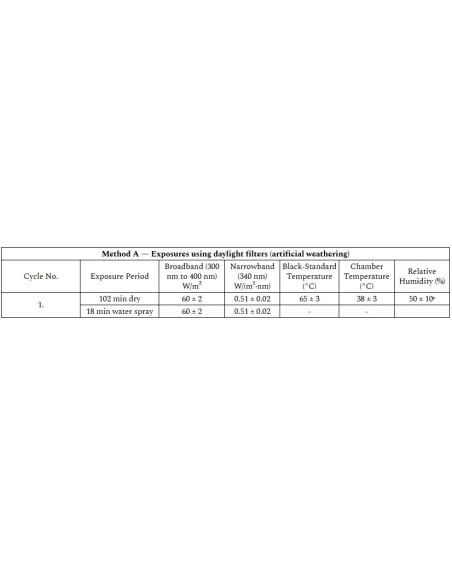 Reprezentatywne próbki materiału, z którego produkujemy pokrowce Mobile Garage zostały poddane badaniu w Instytucie Badań i Rozwoju Motoryzacji BOSMAL. Badanie przeprowadzono według normy PN-ISO 4892-2:2013-6, metoda A, cykle nr 1, składające się z fazy suchej podczas której próbki są naświetlane lampą ksenonową świecącą pełnym widmem światła słonecznego ze zwiększonym natężeniem i z fazy nadeszczania próbek. Poniżej wycinek z normy: