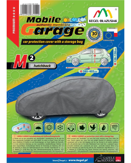 Wysokogatunkowy pokrowiec Mobile Garage to produkt dopasowany do potrzeb kierowców. Pokrowiec wykonany jest z aż 4-warstwowego materiału, który jest gruby, mocny i wytrzymały. Pokrowiec chroni cały samochód przed szkodliwym wpływem środowiska. Pokrowiec Mobile Garage to odpowiednia ochrona pojazdu przez cały rok. Jego funkcjonalność docenić można w każdej porze roku. W sezonie zimowym zapobiega osadzaniu się śniegu, szronu i lodu, a także jest odporny na przymarzanie; na jesieni chroni przed deszczem, wiatrem, liśćmi, sokami z drzew; zaś w porach letnich i wiosennych ochrania przed promieniami UV, pyłem i ptasimi odchodami.