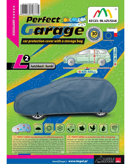 Wysokiej klasy pokrowiec PERFECT GARAGE - nieprzemakalny i paroprzepuszczalny. Produkowany w Polsce, głównie z polskich surowców z zachowaniem wszystkich standardów jakościowych Unii Europejskiej. Lata doświadczenia i coraz bardziej doskonały asortyment sprawia, że pokrowce tejże firmy KEGEL-BŁAŻUSIAK można określić mianem najlepszych w Polsce. Produkt z serii PERFECT GARAGE, której hasłem przewodnim jest- bardzo dobra jakość.