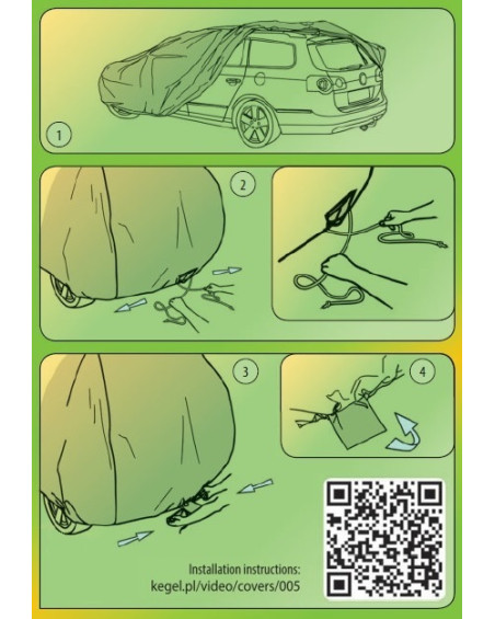 Przed założeniem pokrowca na samochód złożyć boczne lusterka oraz złożyć lub odkręcić antenę. Pokrowiec założyć na czysty i suchy samochód stroną z nadrukiem na zewnątrz. Dla ułatwienia prawidłowego ułożenia pokrowca na samochodzie w pokrowiec wszyta jest wszywka FRONT z przodu pokrowca i REAR z tyłu pokrowca (oznaczenie pokrywają się z przodem i tyłem samochodu).