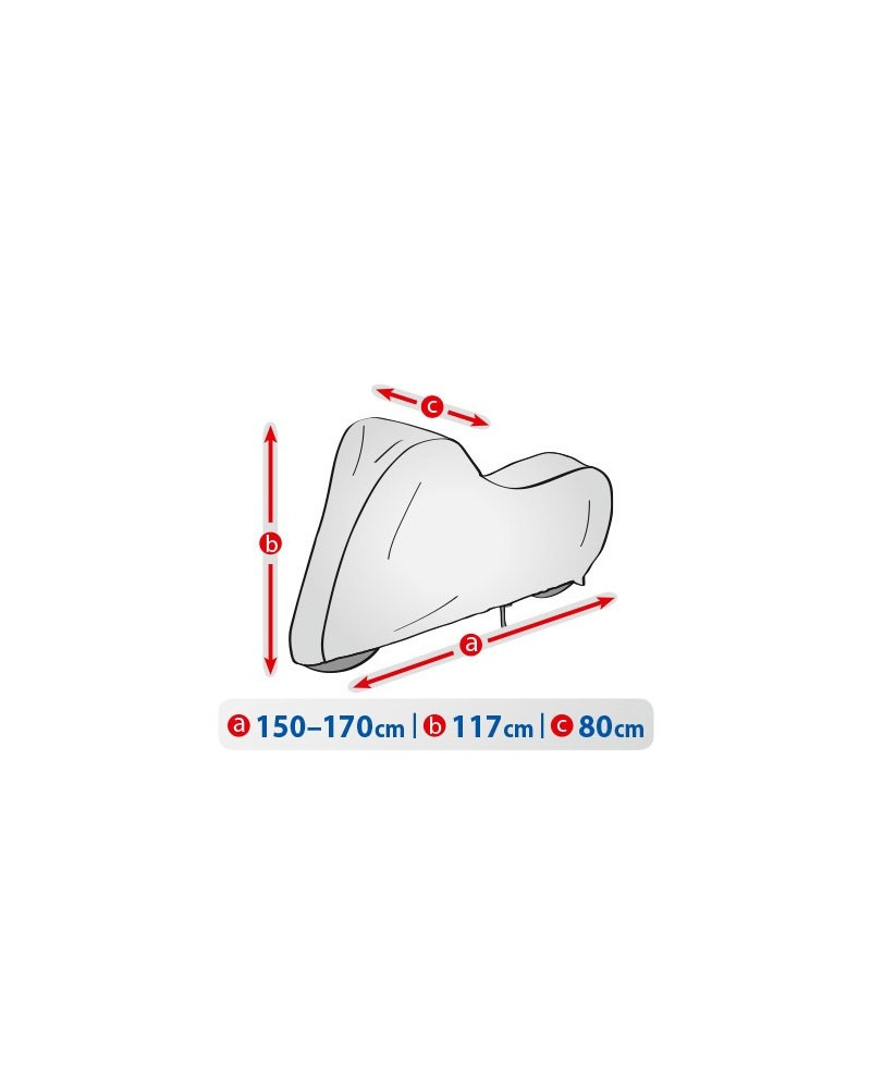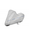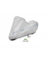 A membrane-based, waterproof and at the same time vapour-permeable cover to protect your combustion or electric scooter from adverse environmental influences. Weatherproof cover made entirely of a highly vapour-permeable membrane. Waterproof even in heavy rain and at the same time vapour-permeable, wicking away moisture from under the cover. Protects against rain, snow, frost and sunlight (harmful UV) as well as contaminants such as dust, bird droppings and tree sap. Reduces corrosion and ageing of plastic parts, protects against fading and tarnishing of paintwork and chrome parts. Suitable for long or short-term outdoor storage of a combustion scooter or short-term storage of an electric scooter. Also suitable for indoor use. A drawstring and additional fasteners underneath the scooter protect the cover from being ripped off by the wind. Holes in the cover allow the scooter to be attached by the front wheel with the cover using a lock or chain.