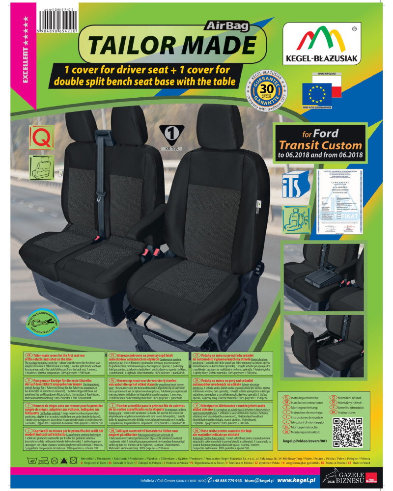 The covers have special, secure seams for airbags, making them suitable for cars with both side airbags in the seats and standard seats. Professional workmanship and safety of use are guaranteed by certification and testing by the Motor Transport Institute.