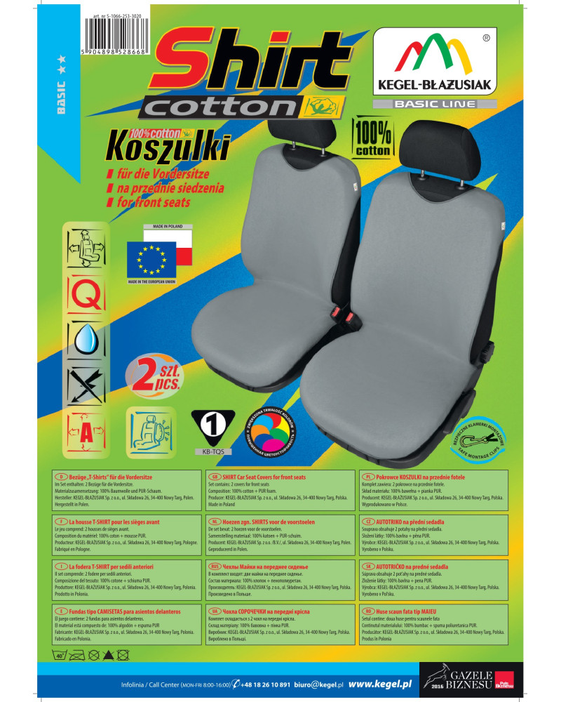 COTTON shirt covers (now SHIRT COTTON – an improved version of shirt covers that have been manufactured for over 17 years) are made of high-quality natural material (100% cotton) , which, combined with the careful finishing of even the smallest details, will satisfy the most demanding customers. Thanks to their appropriate design and innovative construction, the covers fit well on the seats and adhere to them well, and the laminating of the entire material on the inside with PUR foam prevents them from sliding. SHIRT COTTON covers are over 20% larger than their previous version, which makes them a much better fit for the seats of currently manufactured cars. This is because the seats of newer cars are larger than those of cars from 15 years ago. A new feature of the shirt covers is that they cover the entire usable part of the seat, thus better protecting the seat from damage and dirt. However, they do not cover the sides of the seat, so they can be safely used on seats with airbags. Shirt covers oprotect and, at the same time, noticeably change the appearance of car seats, giving the car a unique character.