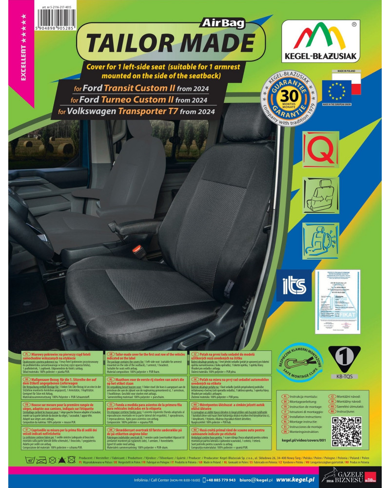 The covers have special, secure seams for airbags, making them suitable for cars with both side airbags in the seats and standard seats. Professional workmanship and safety of use are guaranteed by certification and testing by the Motor Transport Institute.