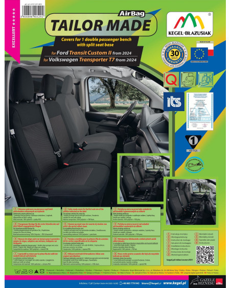 The covers have special, secure seams for airbags, making them suitable for cars with both side airbags in the seats and standard seats. Professional workmanship and safety of use are guaranteed by certification and testing by the Motor Transport Institute.