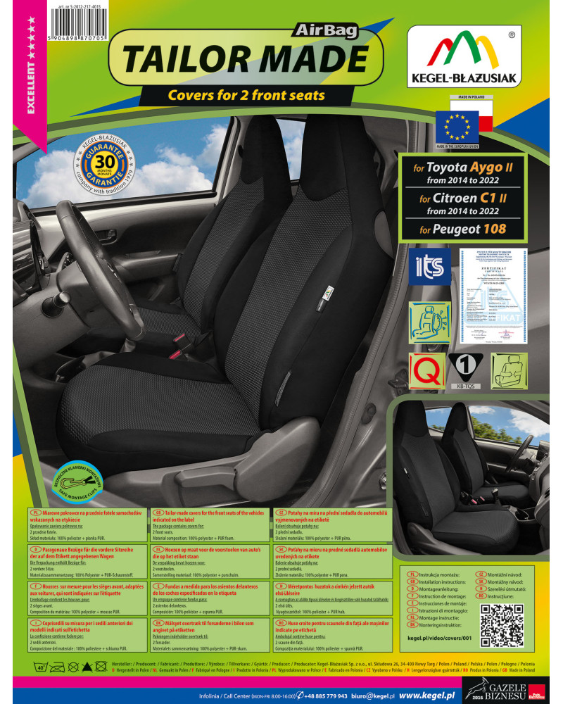 The covers have special, secure seams for airbags, making them suitable for cars with both side airbags in the seats and standard seats. Professional workmanship and safety of use are guaranteed by certification and testing by the Motor Transport Institute.
