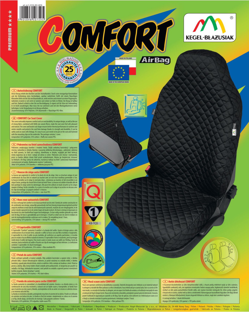 The COMFORT cover is a unique combination of natural cotton fabric and fluffy climate-regulating non-woven fabric, which makes the cover really thick, soft and springy. It allows the user to sink into it comfortably, making the journey much more pleasant. The material is characterised by high, almost 100% colour fastness and resistance to discolouration, abrasion and fading. It is strong, durable and resistant, yet very soft to the touch, like pure cotton. The cover provides effective insulation – it does not heat up in summer and insulates against the cold in winter. The COMFORT cover effectively protects the seat from damage and dirt. The cover fulfils its protective function very well as it covers the entire seat, including the sides and headrest. The headrest protection is integrated into the cover, so that once fitted, the seat looks great and resembles an aircraft seat. It ensures safety as it is adapted to seats with AirBag side cushions. It can be used on both the driver's and passenger's seats, as the safety seam, which tears during the deployment of the airbags, is sewn in on both the left and right sides. The cover is made in a universal size, so it fits most standard car seats. The product is very easy to install and clean.