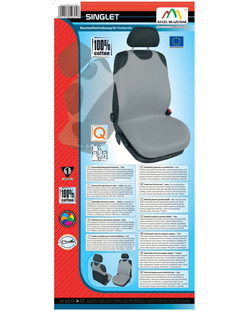 SINGLET series seat covers from the BASIC LINE - range are designed for passenger cars and are made from 100% cotton – a natural material with very high colour fastness and resistance to abrasion and tearing. Thanks to PUR foam lamination on the inside, the covers fit snugly to the seats and do not slip. The covers fit almost any car seat. They are very easy to put on and take off. They are also very easy to clean. T-shirt covers have enjoyed unflagging popularity among customers for years. Professional workmanship and high-quality material guarantee a long service life.