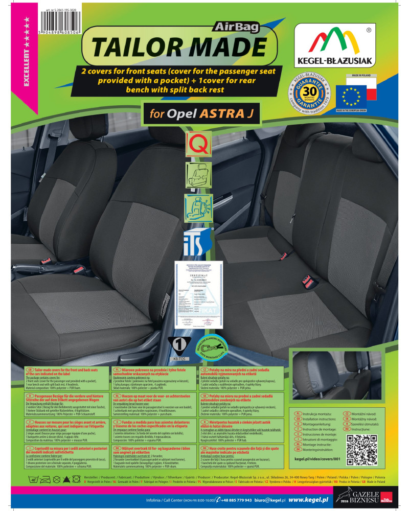 The covers have special, secure seams for airbags, making them suitable for cars with both side airbags in the seats and standard seats. Professional workmanship and safety of use are guaranteed by certification and testing by the Motor Transport Institute.