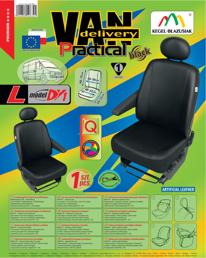 Waterproof, stain-resistant and extremely durable material ensures practical use. The offer is addressed to owners of specific delivery vans and minibuses who want to take care of the interior of their vehicles and add style and elegance to them. The black, universal colour scheme fits perfectly into the interior of any vehicle. The covers look great in any car. They are exceptionally elegant, adding class and charm to any interior. The covers are equipped with the necessary fastened openings that allow you to put on the cover without having to remove the headrests and make additional openings. The design of the cover also allows it to be placed on a seat with an armrest, if the seat has one. The set is equipped with special mounting clips, and fasteners are sewn into the material, making it very easy to install. Any dirt on the cover is very easy to remove – just wipe it with a damp cloth. A product from the renowned company Kegel-Błażusiak, the largest manufacturer and exporter in the car cover and workwear industry. Years of experience and an increasingly sophisticated range of products mean that this brand's covers can be described as the best in Poland. Manufactured in Poland, mainly from Polish raw materials, in compliance with all European Union quality standards. By purchasing Kegel-Błażusiak covers, you are supporting the Polish economy and protecting Polish jobs.