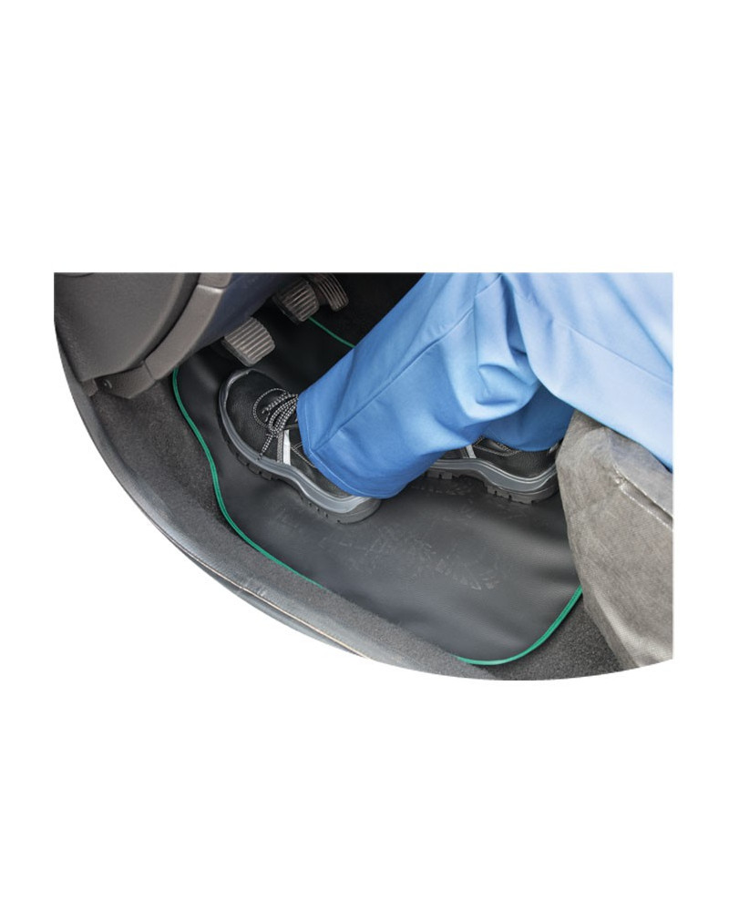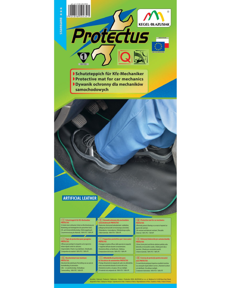 PROTECTUS protective mat – made of new generation eco-leather – waterproof, oil-resistant, grease-resistant. Designed for car mechanics, service station employees, people who drive in dirty work boots, as well as those who want to protect their car's carpet in an aesthetic way during everyday use. The PROTECTUS mat effectively protects the floor covering or mats of a serviced car from dirt and damage. The inside is lined with soft non-woven fabric that gently adheres to the upholstery. An eco-friendly, reusable product. Professionally made of strong, durable material, it is characterised by a long service life. Made in a universal size - for use in any car model. The product is easy to clean.