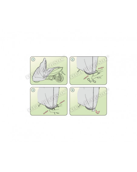 Pokrowiec założyć na czysty skuter czarną stroną pasa pokrowca od wewnątrz. Następnie maksymalnie mocno zaciagnąć linkę ściągacza pokrowca i pewnie ją zawiązać.