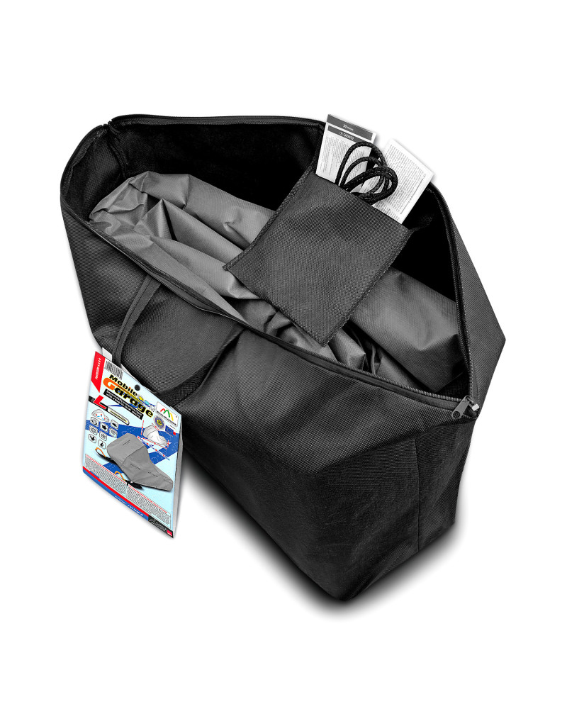 The outer label of the cover shows the cover size and includes a drawing showing the shape and dimensions of the snowmobile the cover is intended for. Please check that you have purchased the right size cover for the snowmobile it will be used on. A well-fitting cover with the drawcord tightened and tied securely can be used safely even in strong winds. The cover is designed to be used on a parked snowmobile and therefore cannot be used when transporting it on an open trailer or other vehicles. The cover does not prevent hidden defects in the paintwork or the effects of damage to the paintwork from becoming visible. A cover that is damaged or soiled on the inside shall not be used.