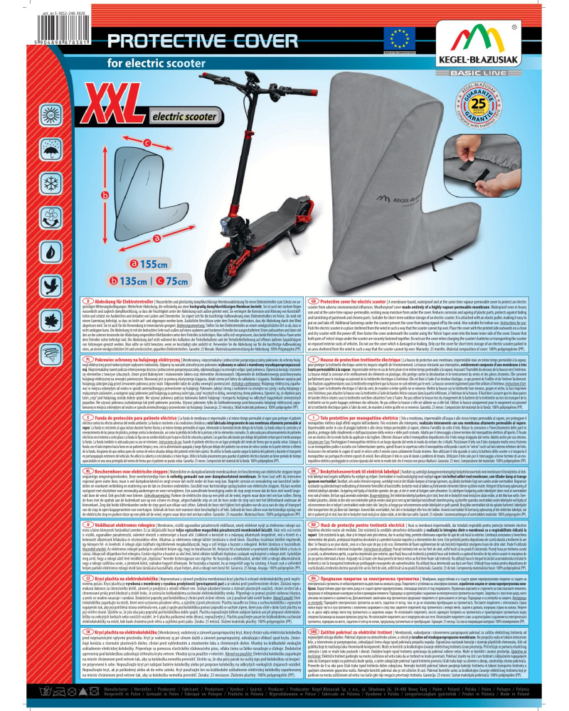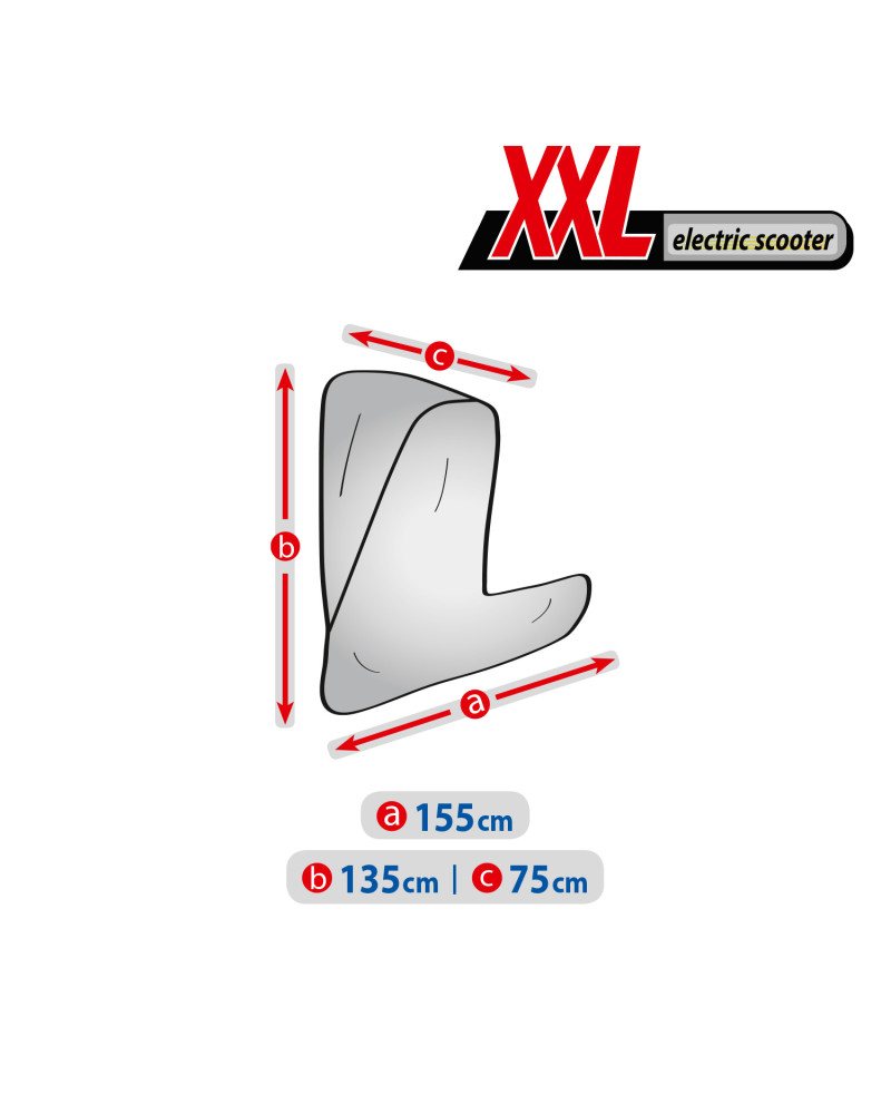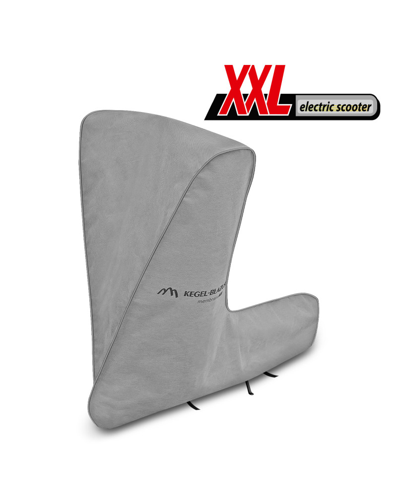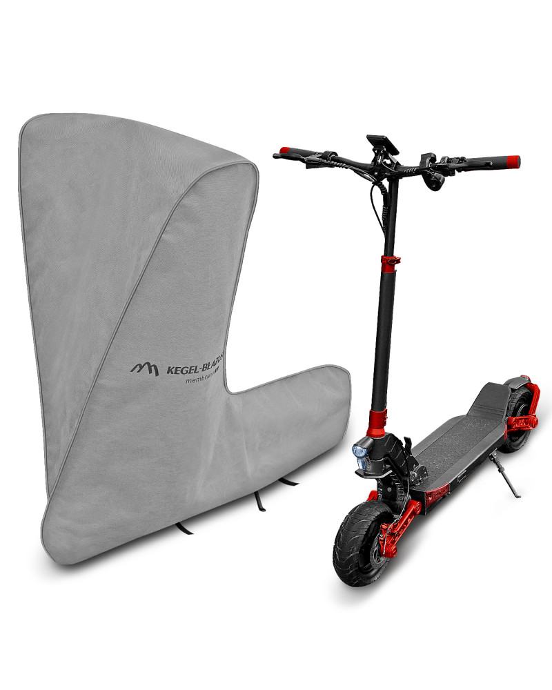 A membrane-based, waterproof and at the same time vapour-permeable cover to protect an electric scooter from adverse environmental influences. Weatherproof cover made entirely of a highly vapour-permeable membrane. Waterproof even in heavy rain and at the same time vapour-permeable, wicking away moisture from under the cover. Reduces corrosion and ageing of plastic parts, protects against fading and tarnishing of paintwork and chrome parts. Suitable for short-term outdoor storage of an electric scooter. It is attached with an elastic puller, making it easy to put on and take off. Additional fastenings under the scooter prevent the cover from being ripped off by the wind. Also suitable for indoor use.