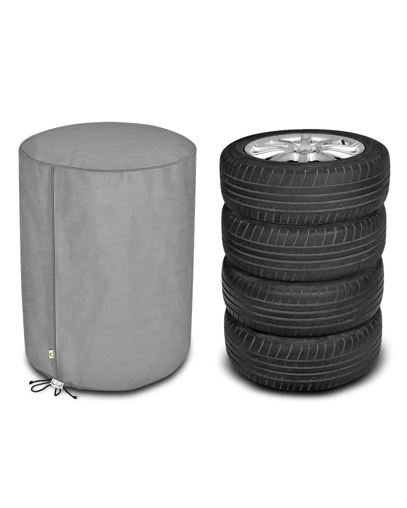 Membrane, waterproof and vapour-permeable cover for protecting car wheels or tyres from adverse environmental conditions. Weather-resistant cover made entirely of highly vapour-permeable membrane. Waterproof even during heavy rain and vapour-permeable at the same time, it wicks moisture accumulating under the cover and volatile substances emitted by tyres to the outside of the cover. It protects stored wheels and tyres from sunlight (harmful UV rays), excessive heat, rain, snow, frost and contaminants such as dust and bird droppings. It reduces tyre ageing and wheel rim corrosion. Easy to put on and take off with a strong puller with a cord to prevent the cover from being torn off by the wind. Suitable for outdoor and indoor use.