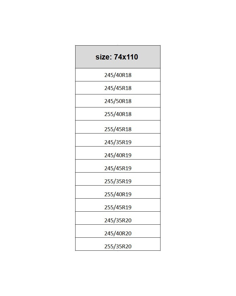 Fits wheels with a size of: 245/40R18, 245/45R18, 245/50R18, 255/40R18, 255/45R18, 245/35R19, 245/40R19, 245/45R19, 255/35R19, 255/40R19, 255/45R19, 245/35R20, 245/40R20, 255/35R20.