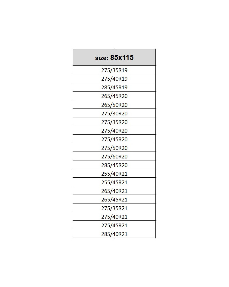 Fits wheels with a size of: 275/35R19, 275/40R19, 285/45R19, 265/45R20, 265/50R20, 275/30R20, 275/35R20, 275/40R20, 275/45R20, 275/50R20, 275/60R20, 285/45R20, 255/40R21, 255/45R21, 265/40R21, 265/45R21, 275/35R21, 275/40R21, 275/45R21, 285/40R21.
