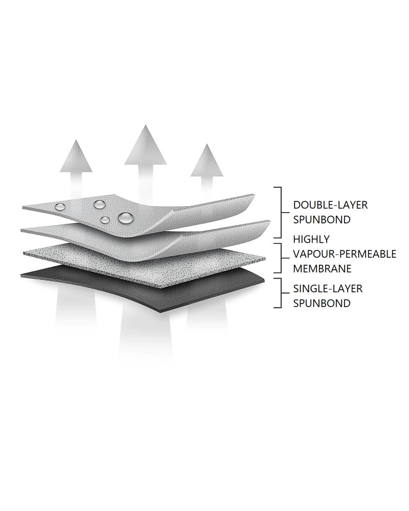 A vapour permeability rating of 317 means that 317 g of water vapour passed through one square metre of KB Textil 400 grey membrane in 24 hours at a temperature of approx. 20 degrees Celsius. Waterproofness with a score of 550 means that the KB Textil 400 grey membrane only became wet at a water column height of 550 cm (i.e. 5500 mm), which means that the membrane is completely waterproof even during heavy and prolonged rain.