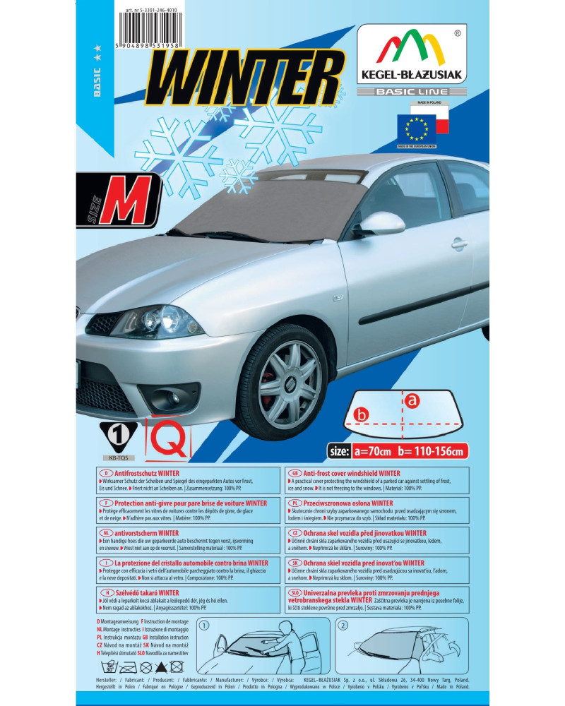 The WINTER anti-frost cover effectively protects the windows of your parked car from frost, ice and snow. It will protect your car and also provide you with comfort and convenience. It will save you time and energy wasted every day on scraping frost off your car windows. Made of high-quality SPUNBOND non-woven fabric with high resistance to freezing. Professionally made of strong yet gentle material that does not damage or scratch the windscreen. Reusable product. Made in a universal size – suitable for most car models. Very easy to install and clean. Low temperatures will no longer be a problem!